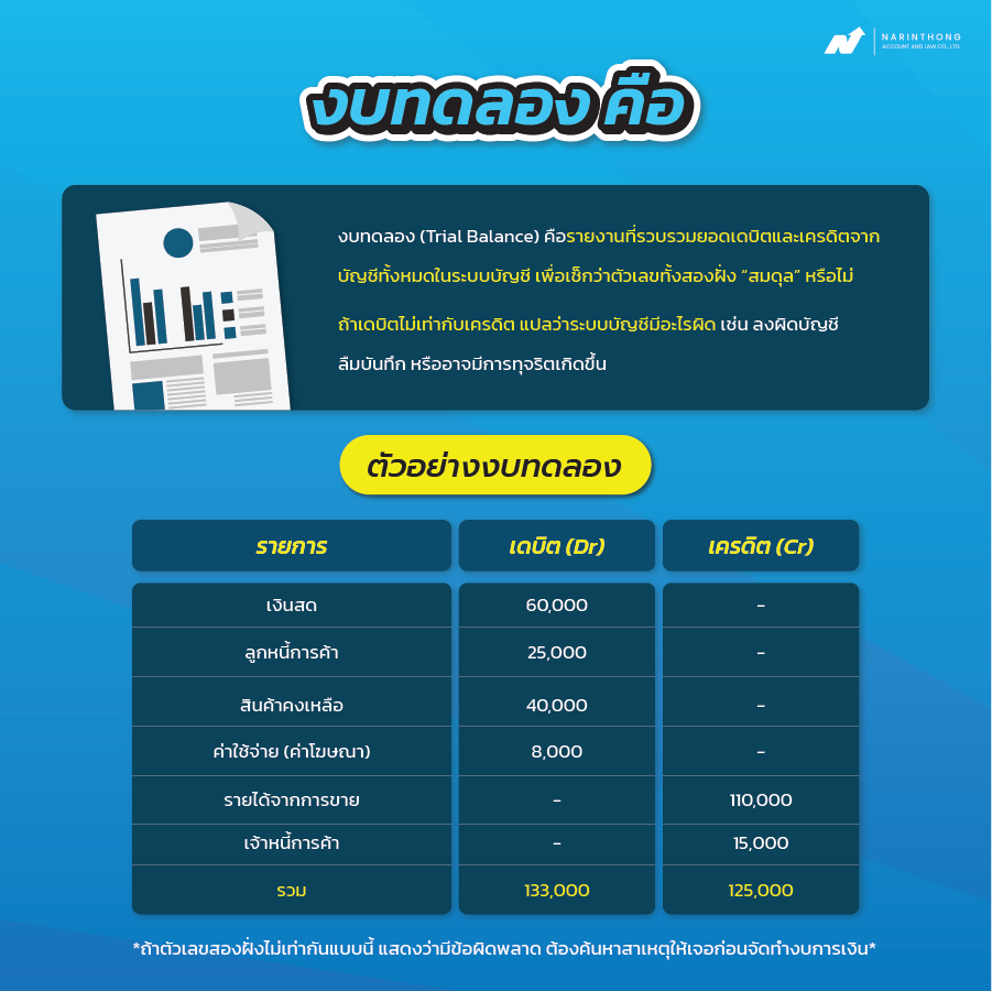 งบทดลองเหมือนรายงานภาพรวมธุรกิจในช่วงเวลานั้นๆ เช่น